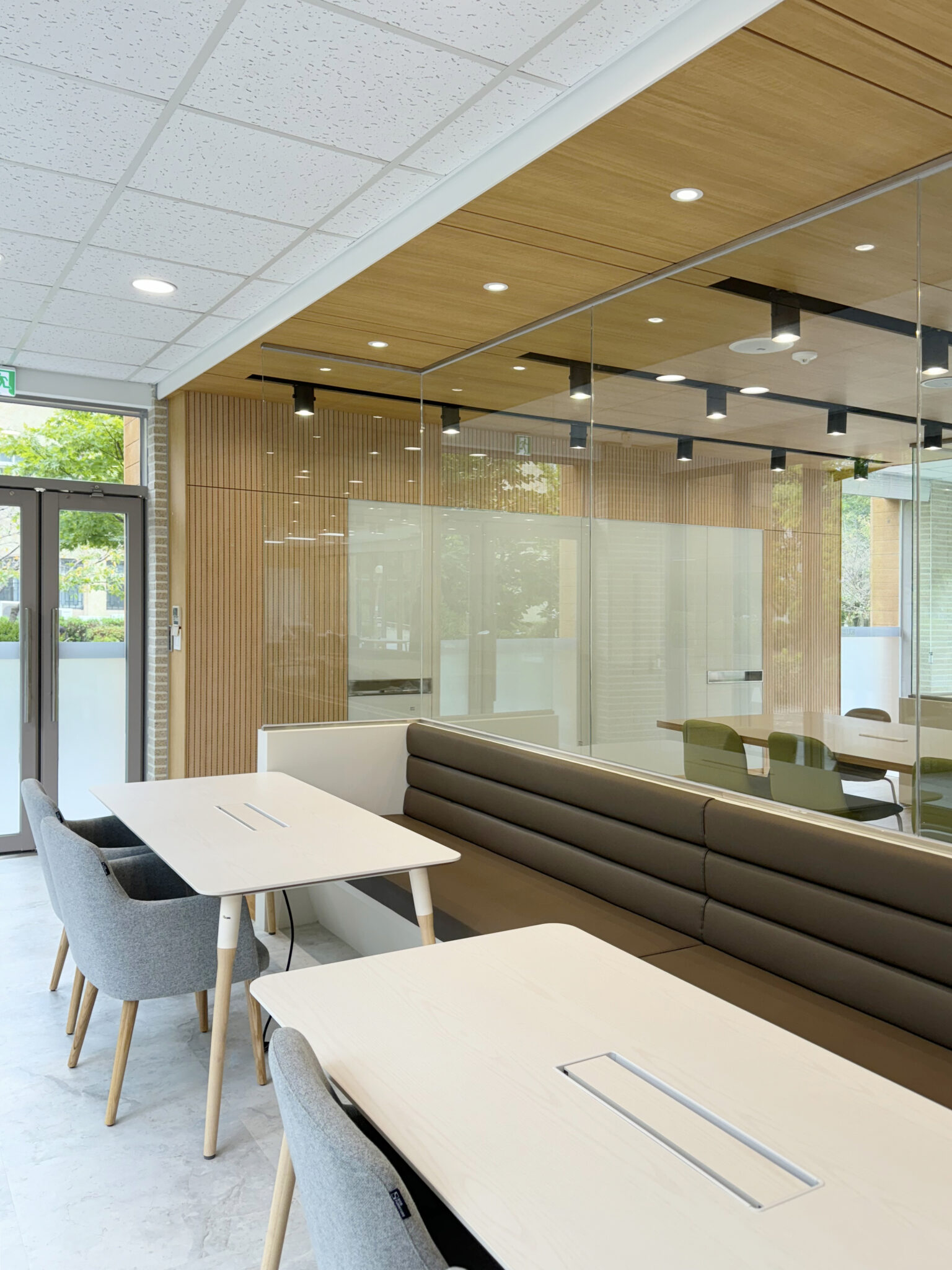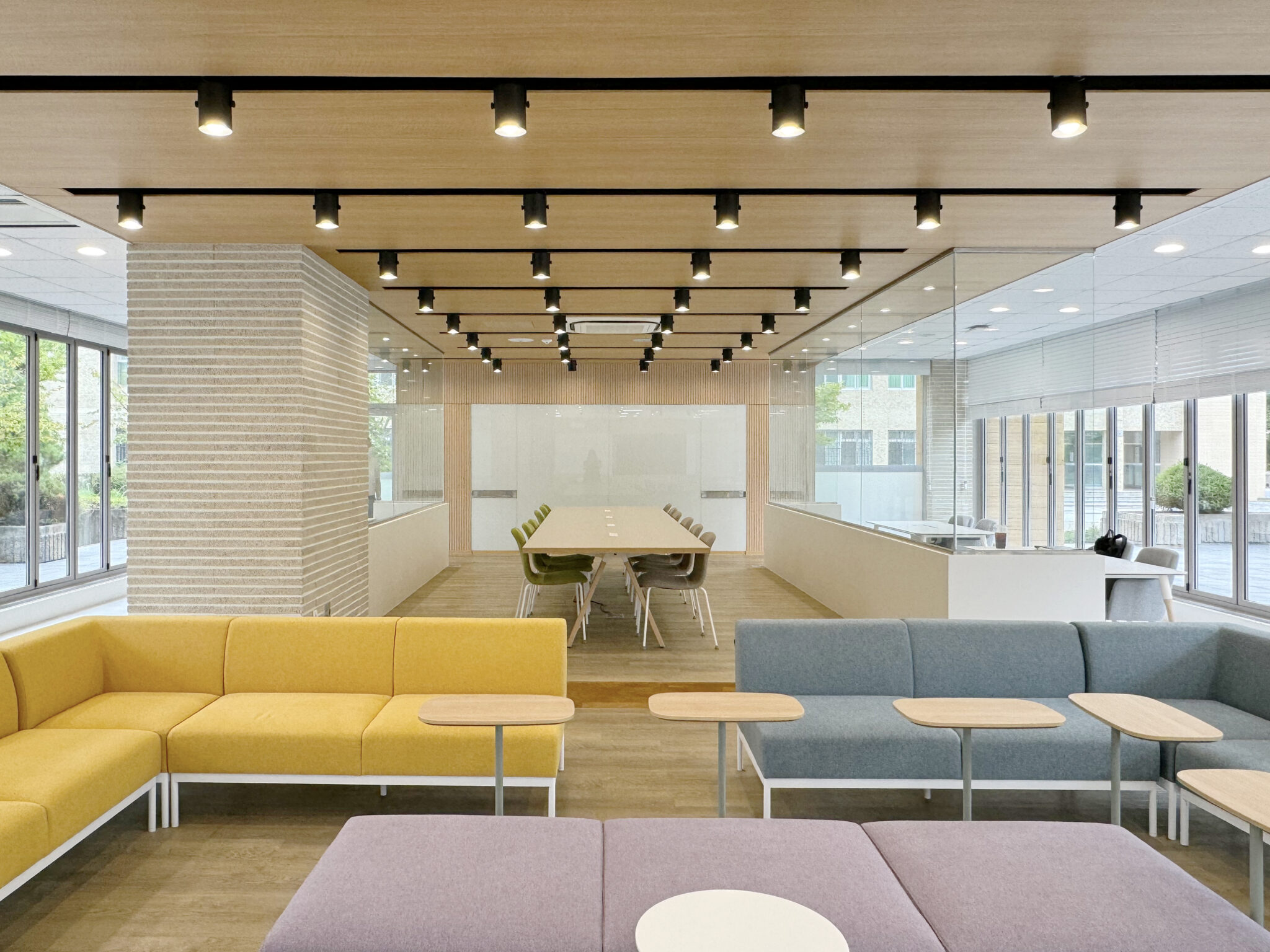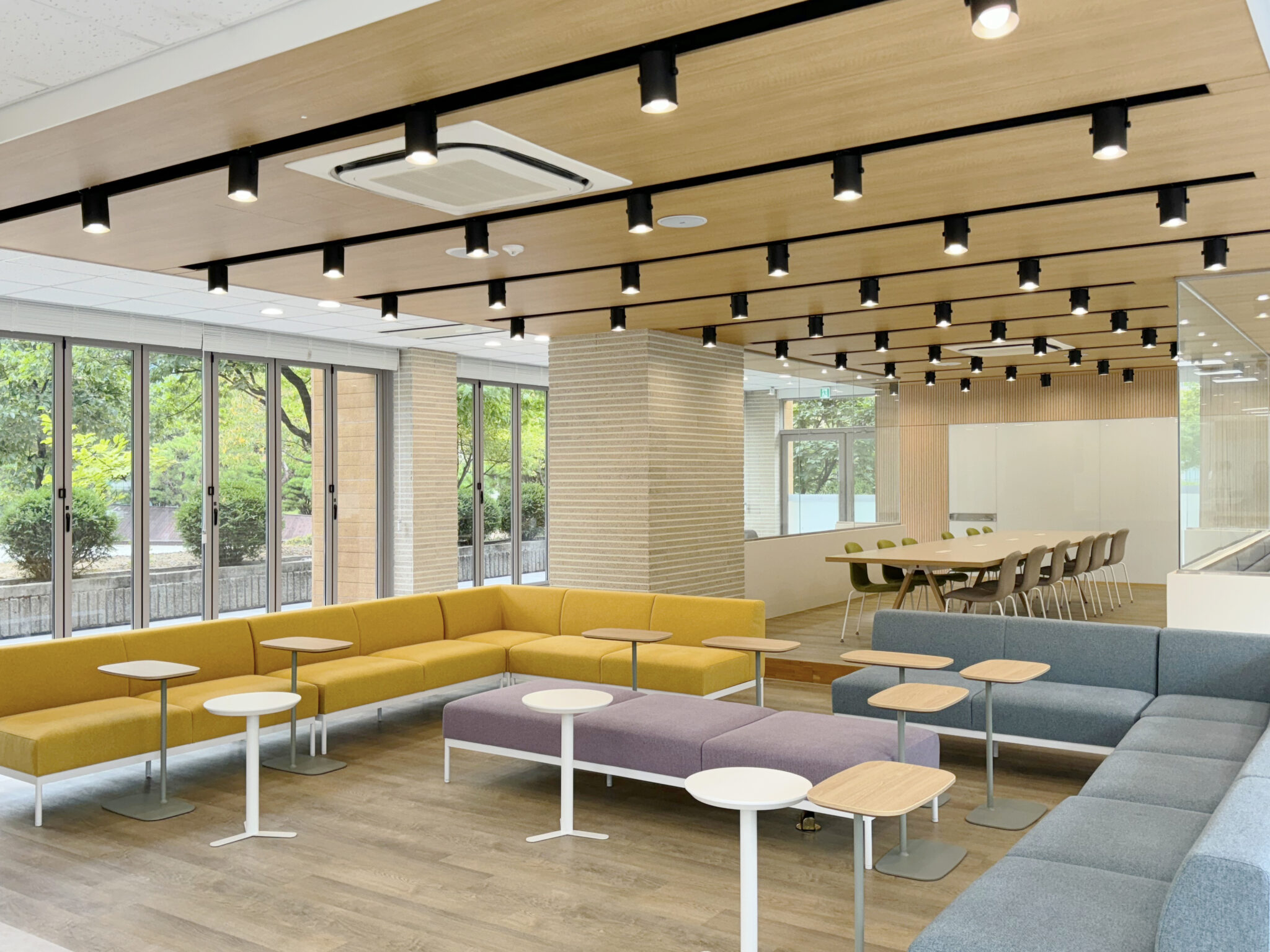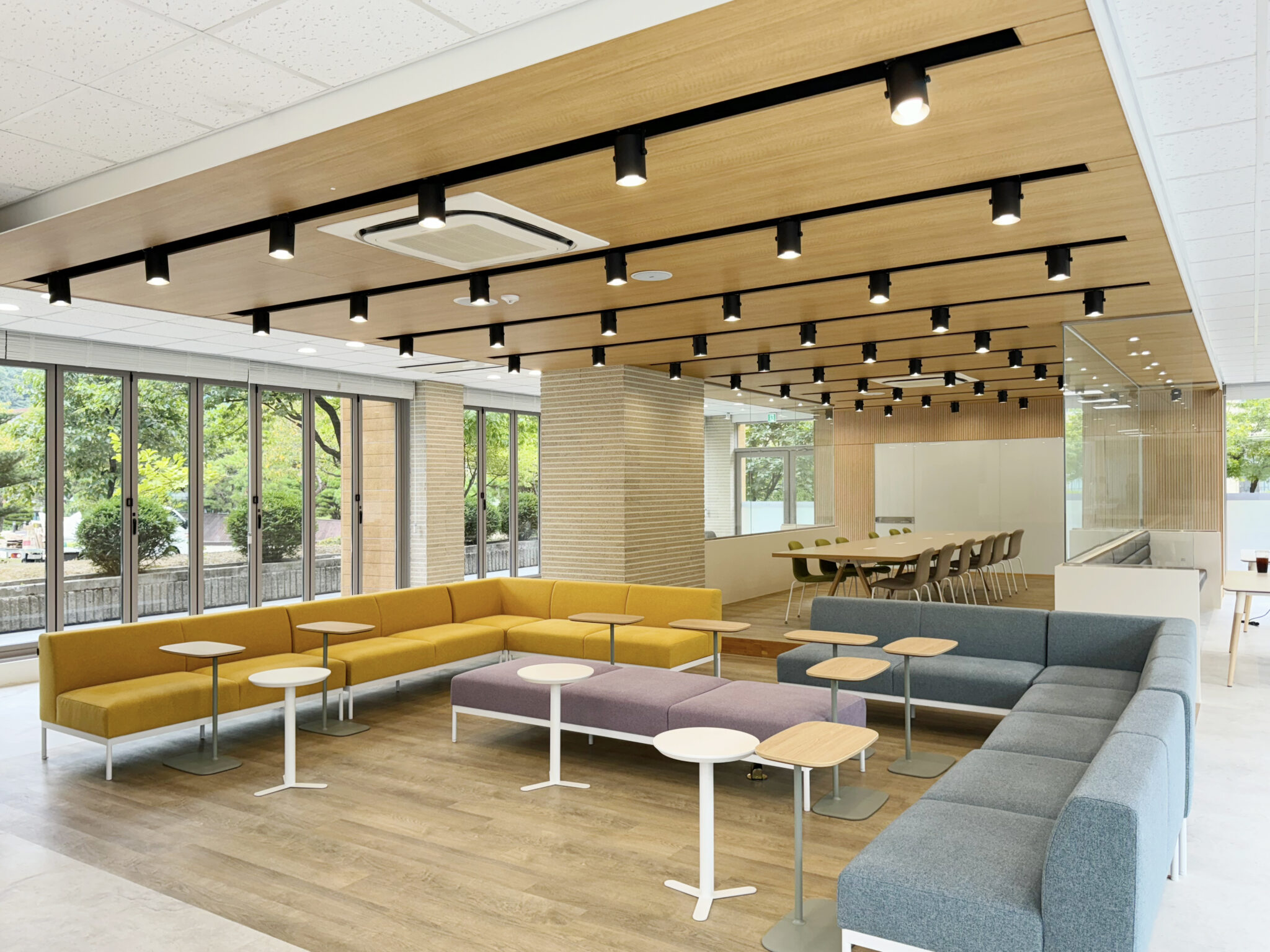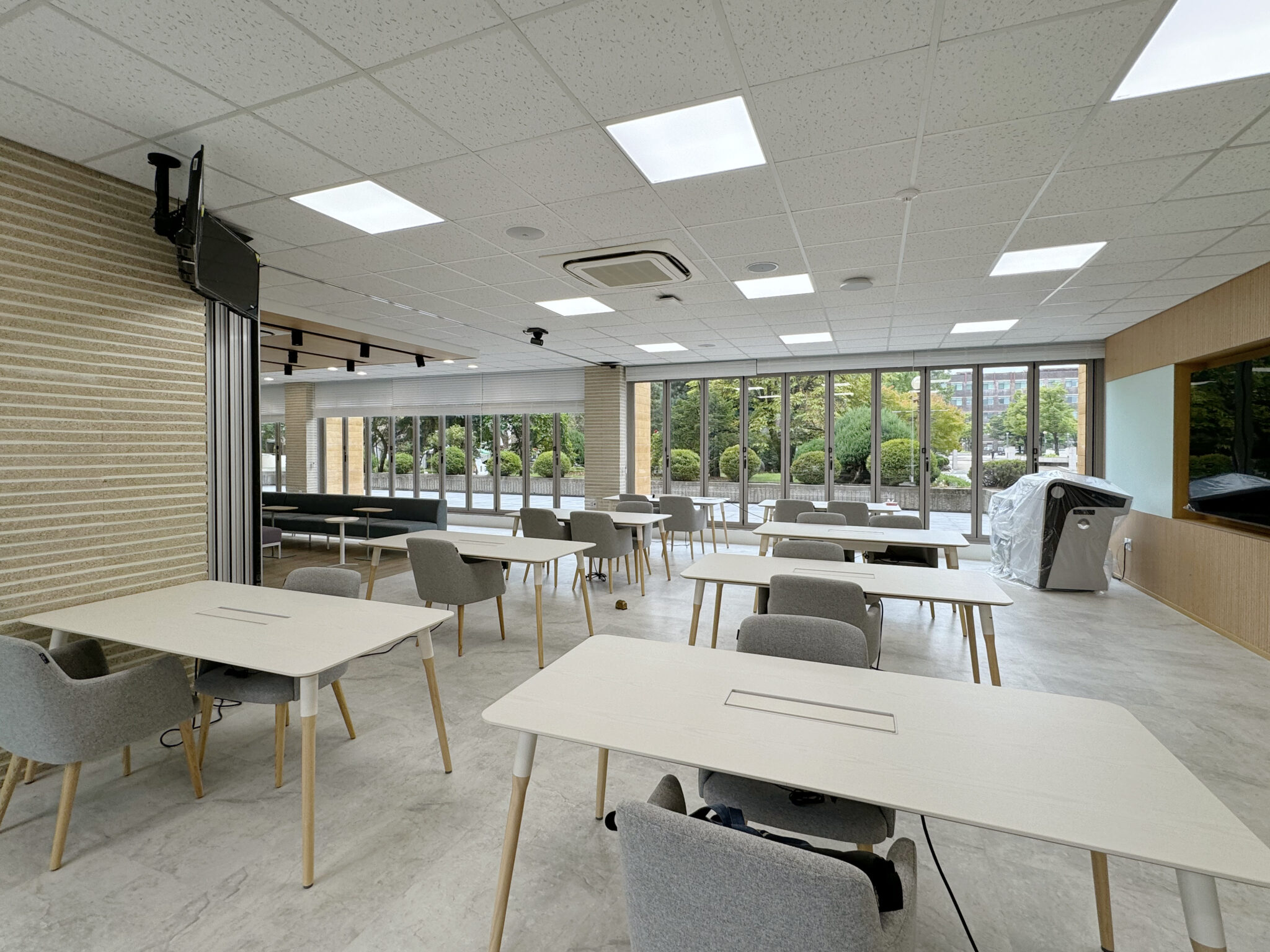 프로젝트: 건국대 글로컬캠퍼스 Interaction Lounge 구축공사 AREA: 204.23㎡(61py) TYPE: 교육공간-University MATERIAL: 바닥-데코타일, 벽-도장,타일,가구, 필름 Category: 사무 교육공간 Date: 2025-08-22 Share: