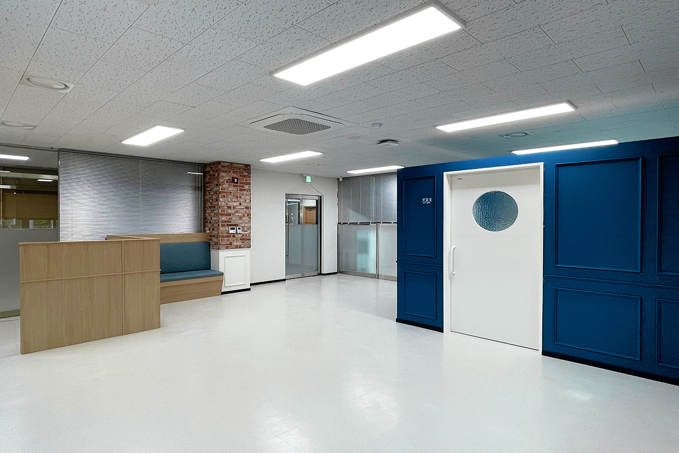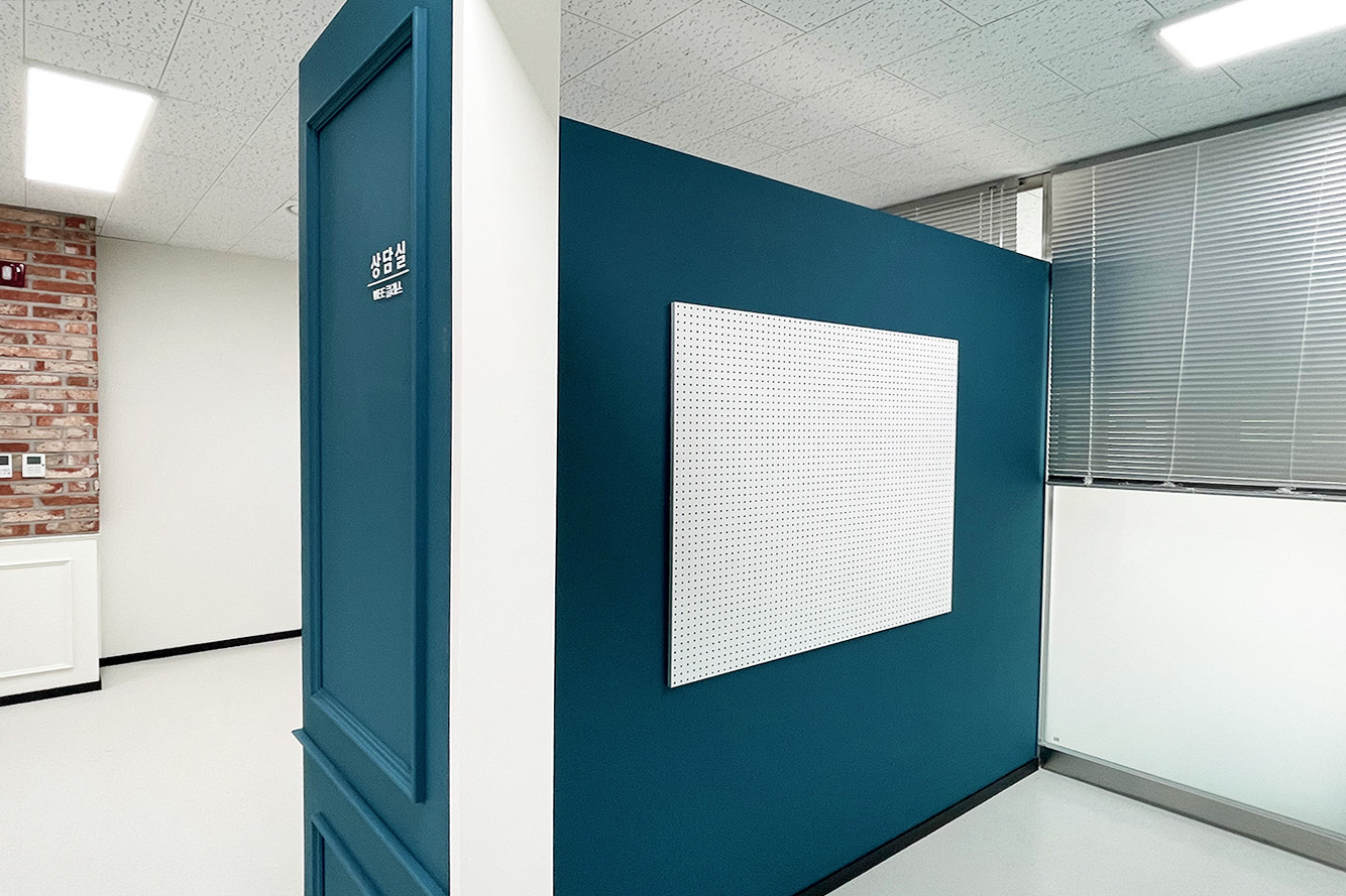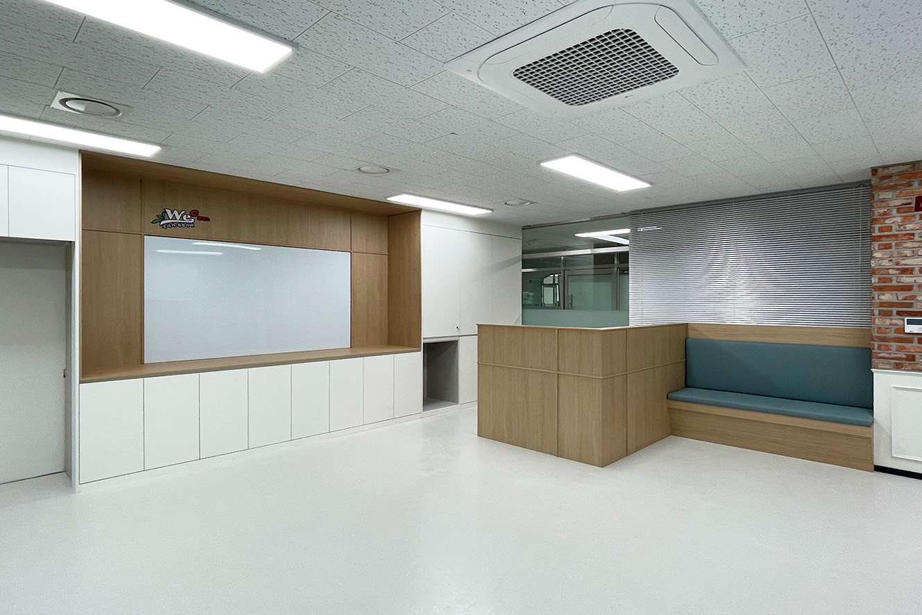 프로젝트: 충북체육중 위클래스 인테리어공사 AREA: 57.43㎡(17py) TYPE: 교육공간-Middle school MATERIAL: 바닥-데코타일, 벽-도장, 필름, 가구, 파벽돌 Category: 사무 교육공간 Date: 2025-08-22 Share:
