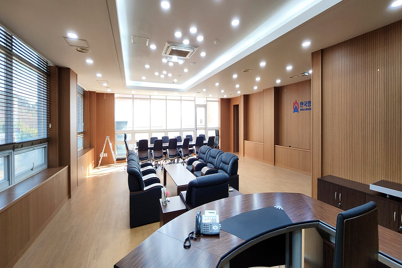 프로젝트: 한국영상대 부총장실 환경개선공사 AREA: 109.60㎡(33py) TYPE: 교육공간-University MATERIAL: 벽-흡음판,필름 Category: 사무 교육공간 Date: 2025-08-22 Share: