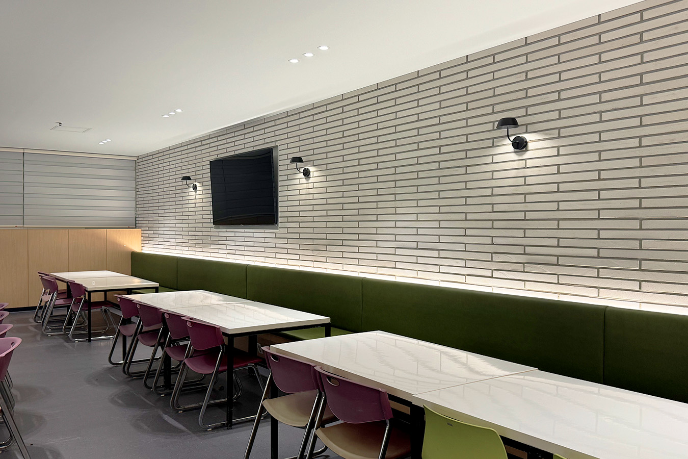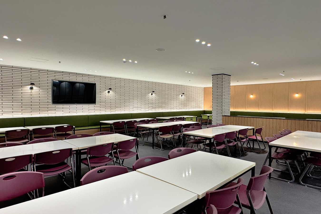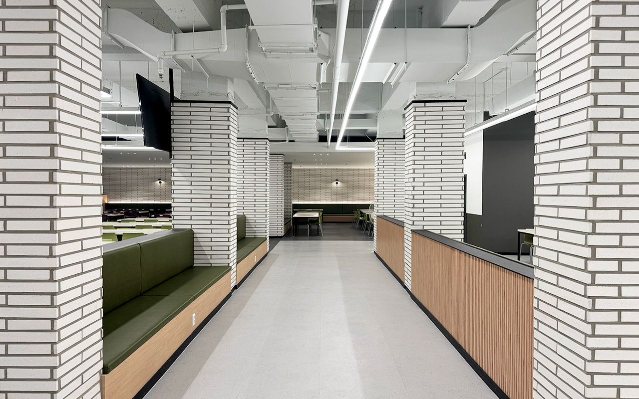 프로젝트: 한국영상대 혁신지원사업 학생식당 및 체련실 인테리어공사 AREA: 780.07㎡(235py) TYPE: 교육공간-University MATERIAL: 바닥-데코타일, 벽-도배, 도장, 필름, 가구, 타일 Category: 사무 교육공간 Date: 2025-08-22 Share: