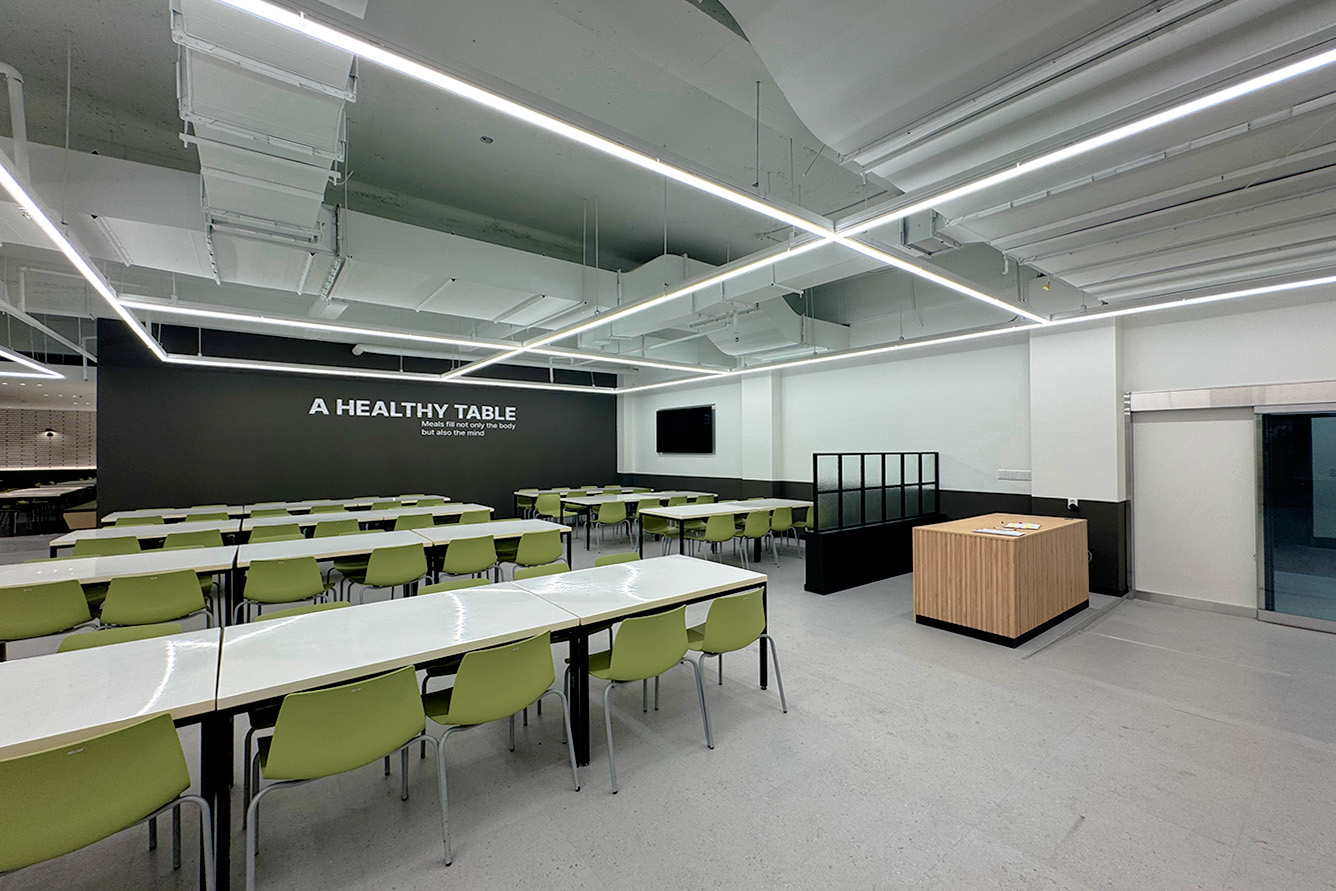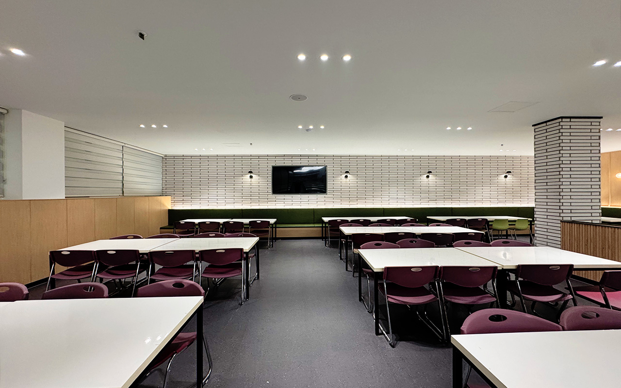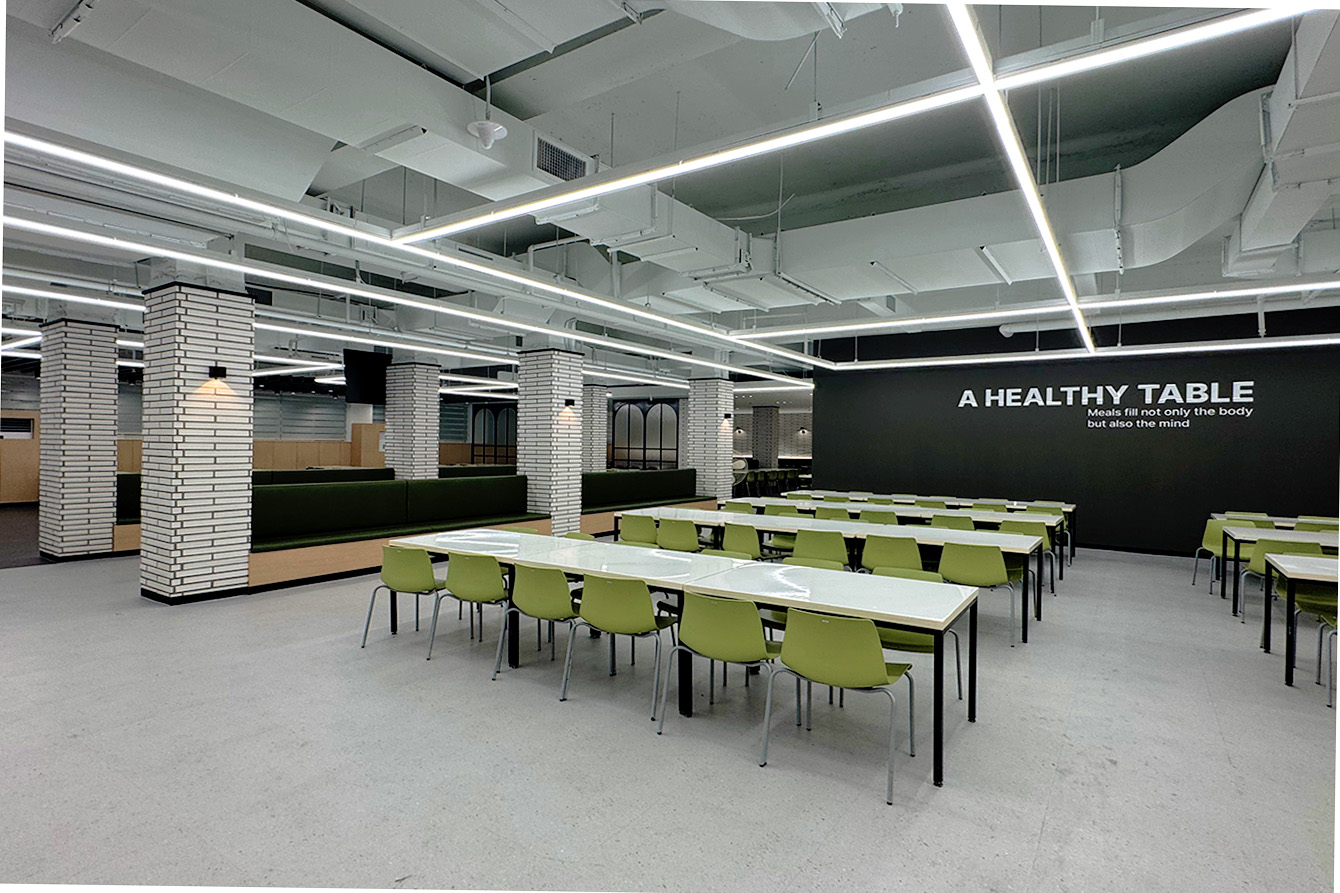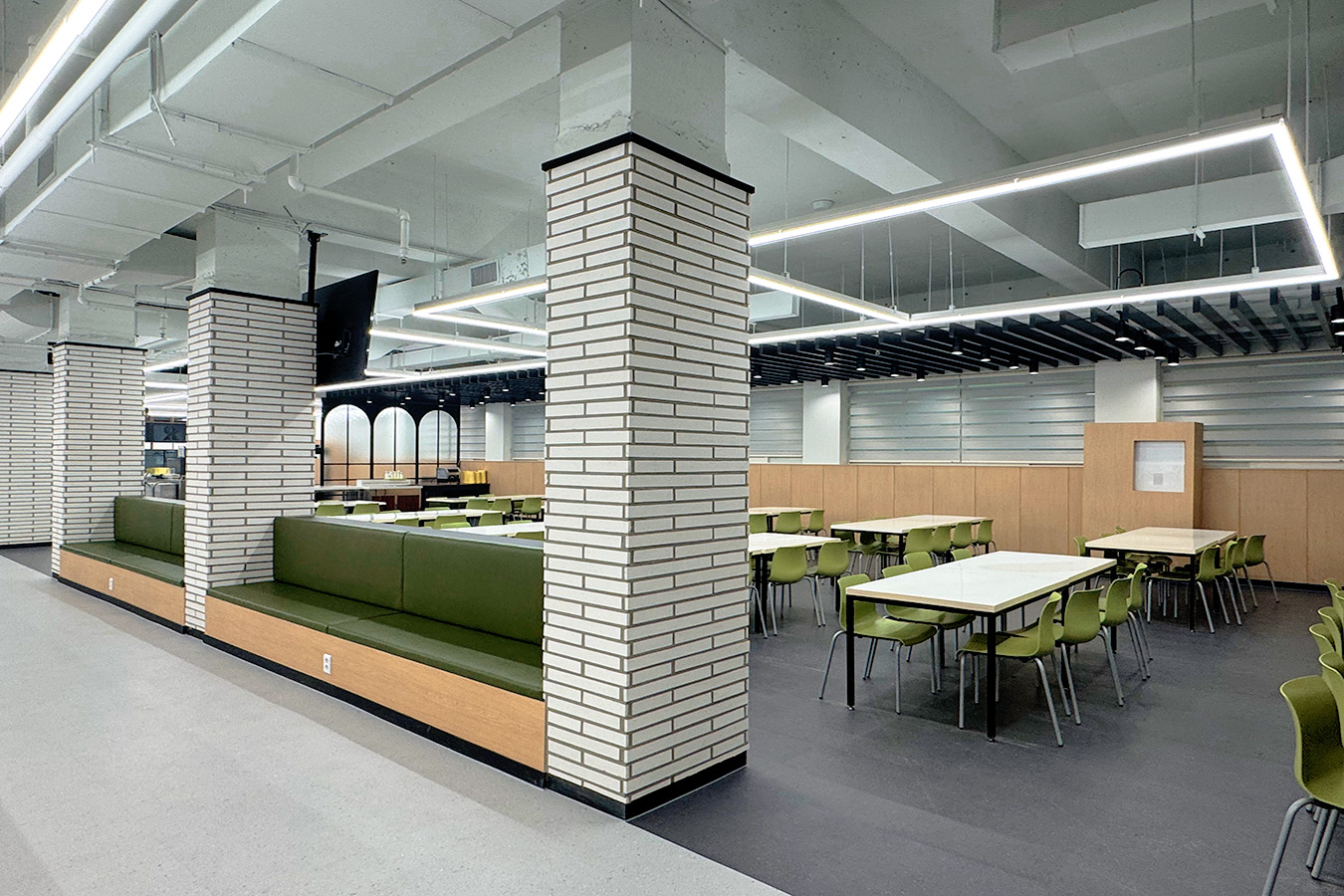 프로젝트: 한국영상대 혁신지원사업 학생식당 및 체련실 인테리어공사 AREA: 780.07㎡(235py) TYPE: 교육공간-University MATERIAL: 바닥-데코타일, 벽-도배, 도장, 필름, 가구, 타일 Category: 사무 교육공간 Date: 2025-08-22 Share:
